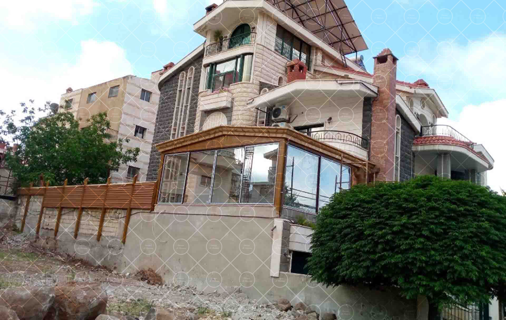 وتراس خارجي من البلور والسيكوريت مع تصميم احتمالية أن يكون مفتوح بشكل شبه كامل للاستفادة من الهواء صيفاً ويحوي على تصميم لشيمونيه وتم مراعاة رغبات المالك وتصميمها بطريقة فنية وهندسية.